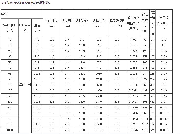 1.未作特別說(shuō)明,電纜額定電壓(Uo/U)均為0.6/lkV銅導(dǎo)體單芯低壓電力電纜。