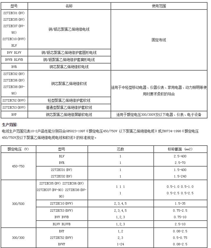 |本產(chǎn)品適用于交流額定電壓450/750V及以下的家用電器、小型電動(dòng)工具、儀器儀表及動(dòng)力照明裝置電源連接,其型號(hào)、名稱及使用范圍見表。電線的工作溫度除BV—90、RV—90為90℃外,其余均為700℃。